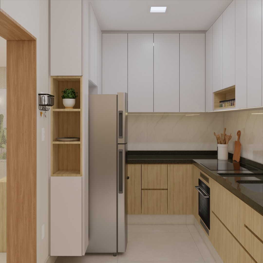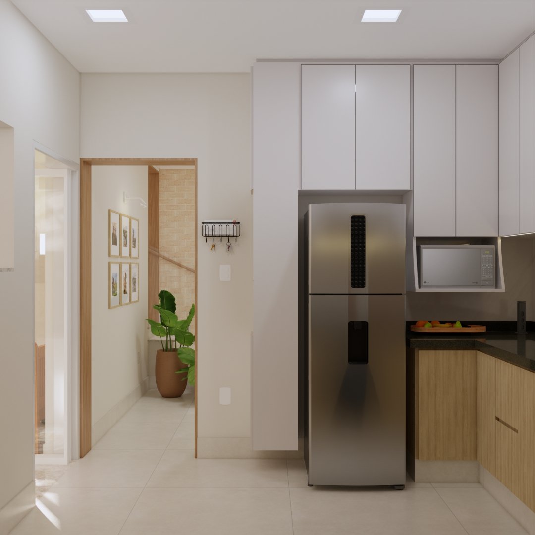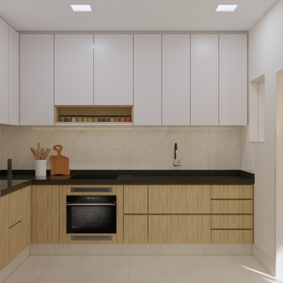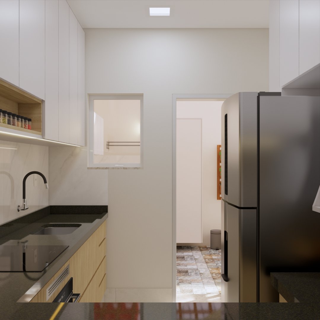 Cozinha intimista, mas bem distribuída, proporcionando praticidade e agilidade na hora de cozinhar.
