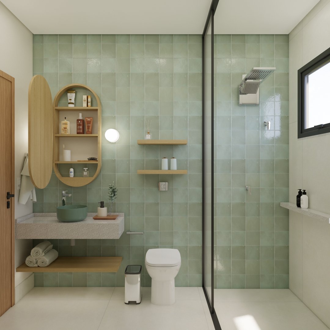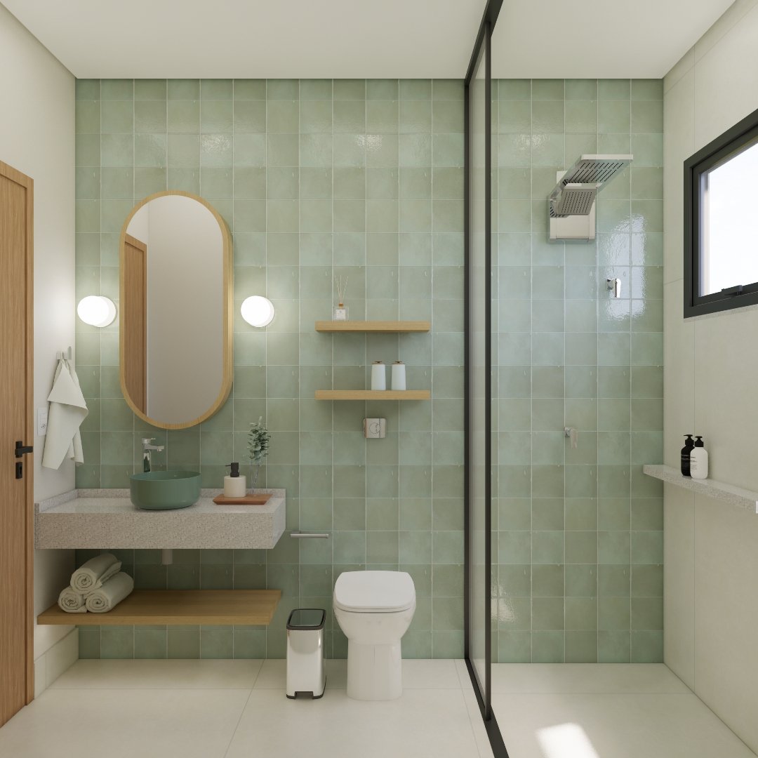 Um banheiro verde e super convidativo.