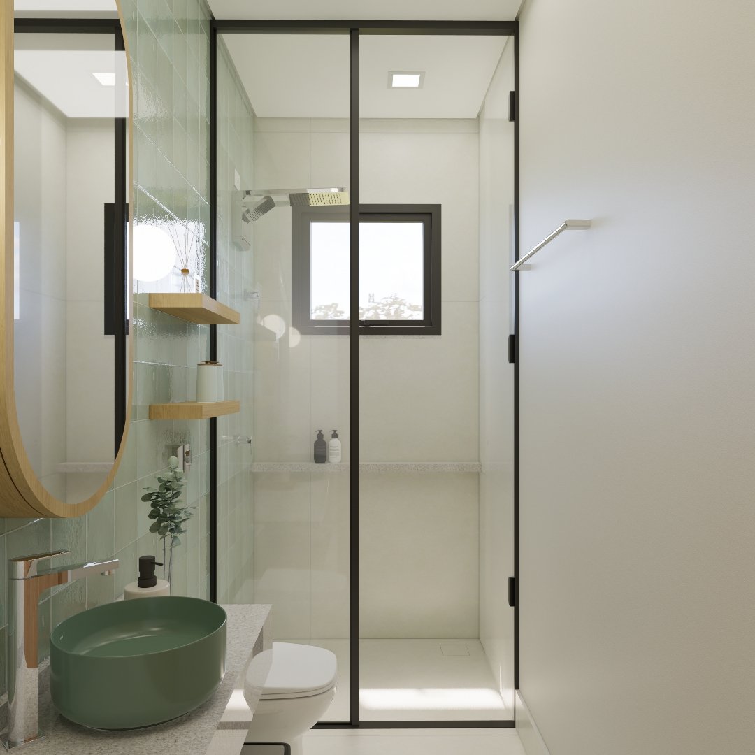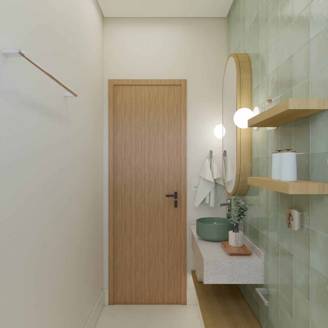 A combinação da cuba e revestimentos verdes deixou um banheiro pequeno amplo e com personalidade.
